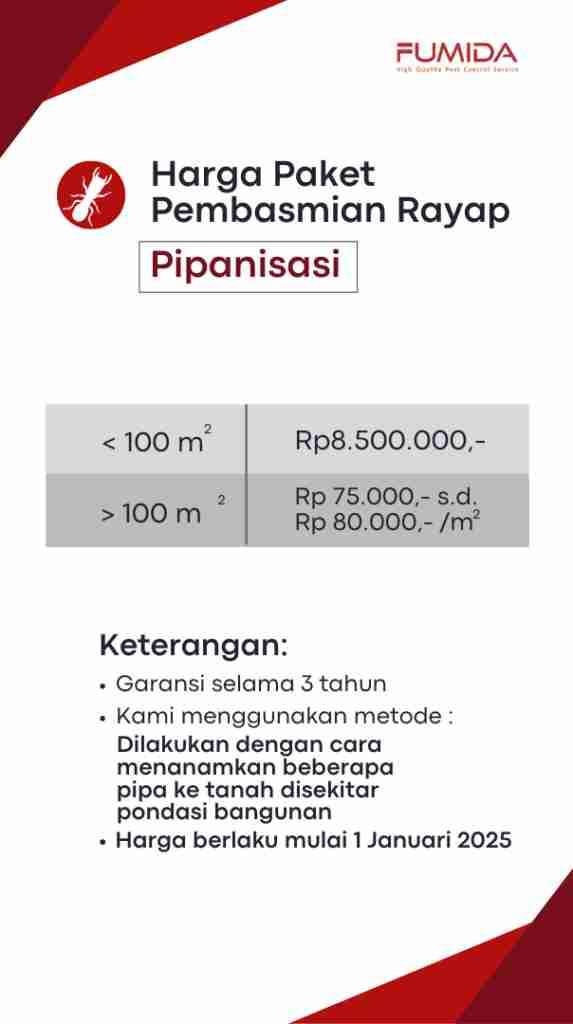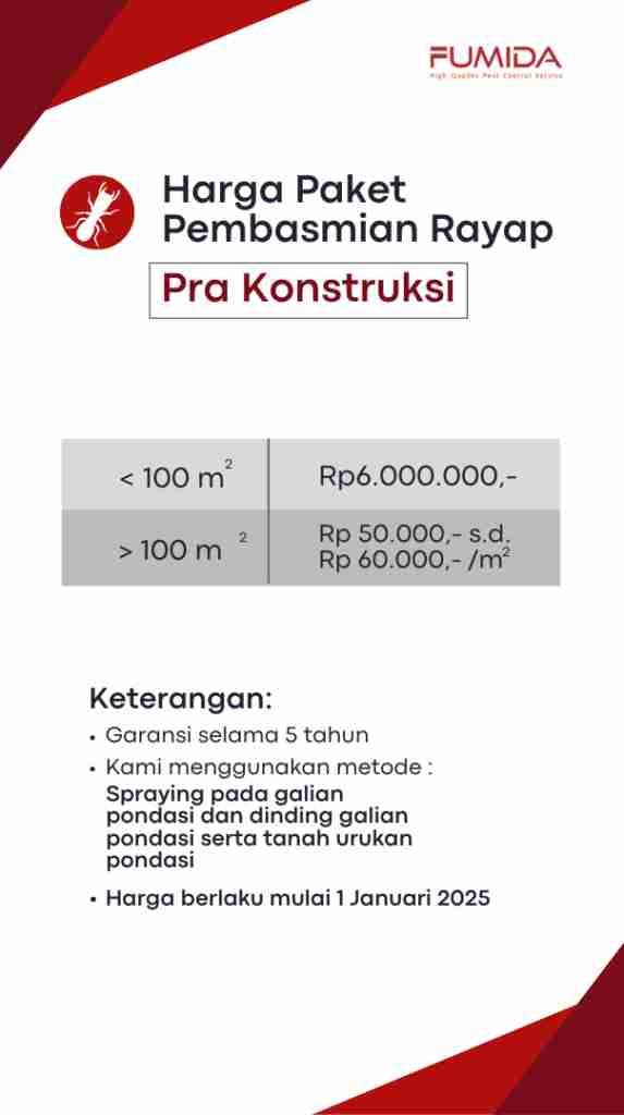 Harga untuk sekali penggunaan jasa anti rayap Fumida mulai dari Rp4,5 juta untuk bangunan dengan luas dibawah 100 meter persegi. Harga mungkin akan lebih tinggi dari yang ditawarkan sesuai dengan desain dan kesulitan bangunan untuk membasmi hama rayap. Di abwah ini adalah detail harga jasa anti rayap Fumida.
